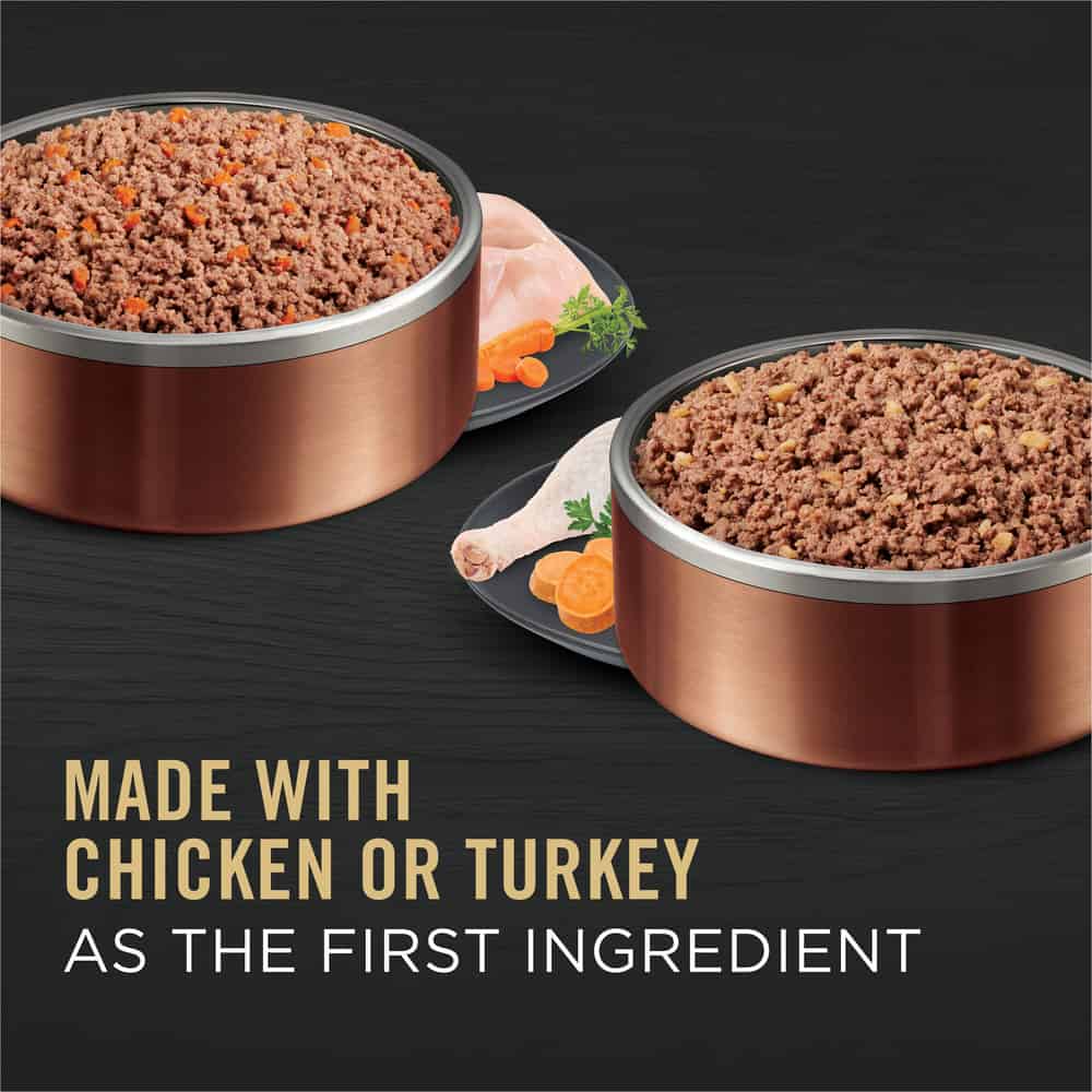 Each entree features real chicken or turkey as the first ingredient for a taste dogs love, and both formulas offer high protein to help your dog maintain muscle mass. They get the tastes and textures dogs love in every bowlful, along with 23 essential vitamins and minerals to help support overall health and wellness. Each pate dog food loaf formula helps support healthy immune system while nourishing your dog's healthy skin and coat.