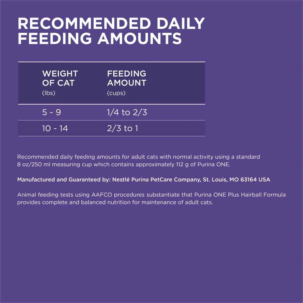 Purina ONE +Plus Hairball Formula Chicken Dry Cat Food Dosage: