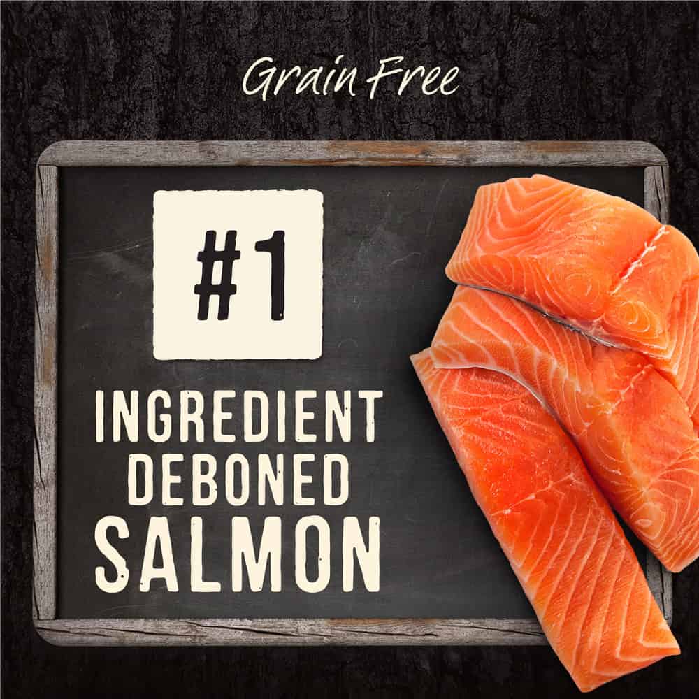 | Ingredients: Deboned Salmon, Salmon Meal, Whitefish Meal, Sweet Potatoes, Potatoes, Peas, Pea Protein, Natural Flavor, Pork Fat, Whitefish, Sunflower Oil, Flaxseed, Dried Yeast, Tapioca, Potassium Chloride, Salt, Choline Chloride, Minerals (Zinc Amino Acid Complex, Iron Amino Acid Complex, Sodium Selenite, Manganese Amino Acid Complex, Copper Amino Acid Complex, Calcium Iodate), DL-Methionine, Taurine, Mixed Tocopherols for freshness, Vitamins (Vitamin E Supplement, Vitamin B12 Supplement, Vitamin A Supplement, Niacin, Thiamine Mononitrate, Riboflavin Supplement, d-Calcium Pantothenate, Folic Acid, Menadione Sodium Bisulfite Complex, Biotin, Pyridoxine Hydrochloride, Vitamin D3 Supplement). |
