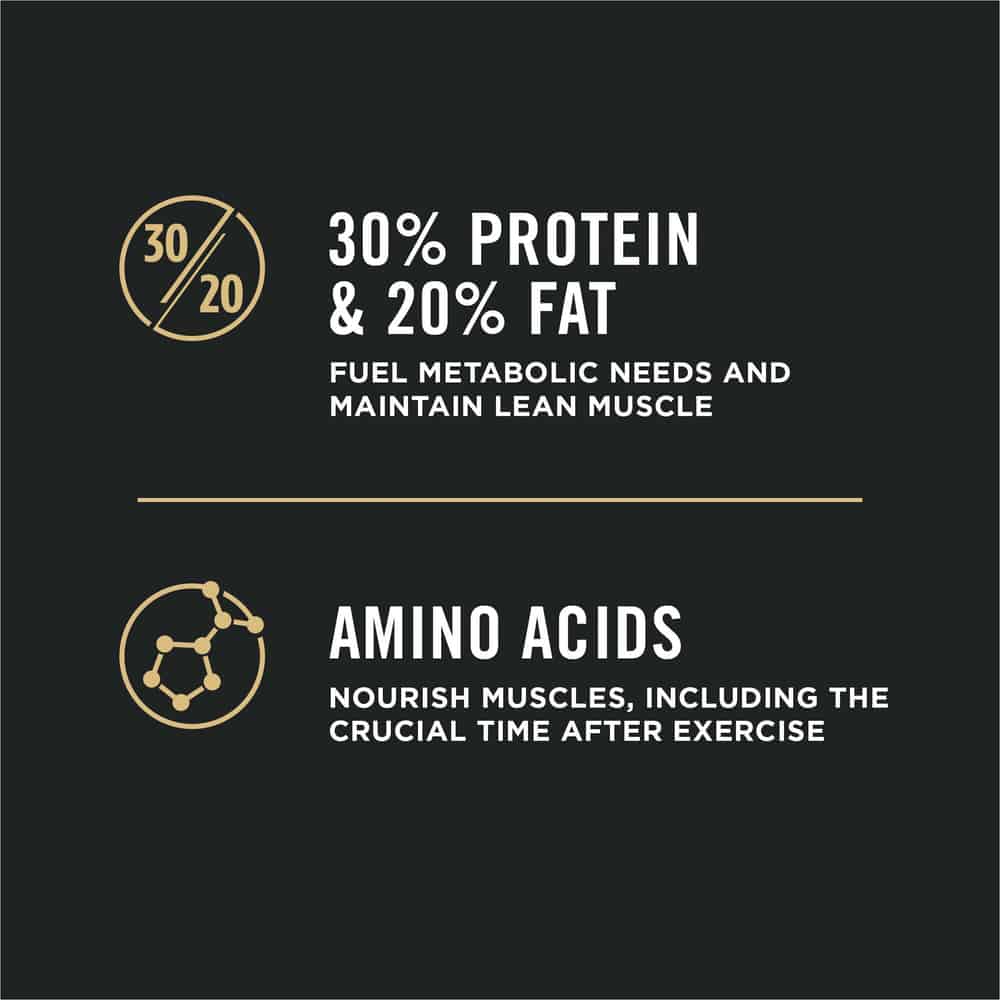 The blend of 30 percent protein and 20 percent fat assists in caring for your dog's metabolic needs, and it also helps them maintain lean, strong muscles. Amino acids help nourish the muscles including the crucial time immediately following exercise, while the EPA and glucosamine help support joint health and mobility.