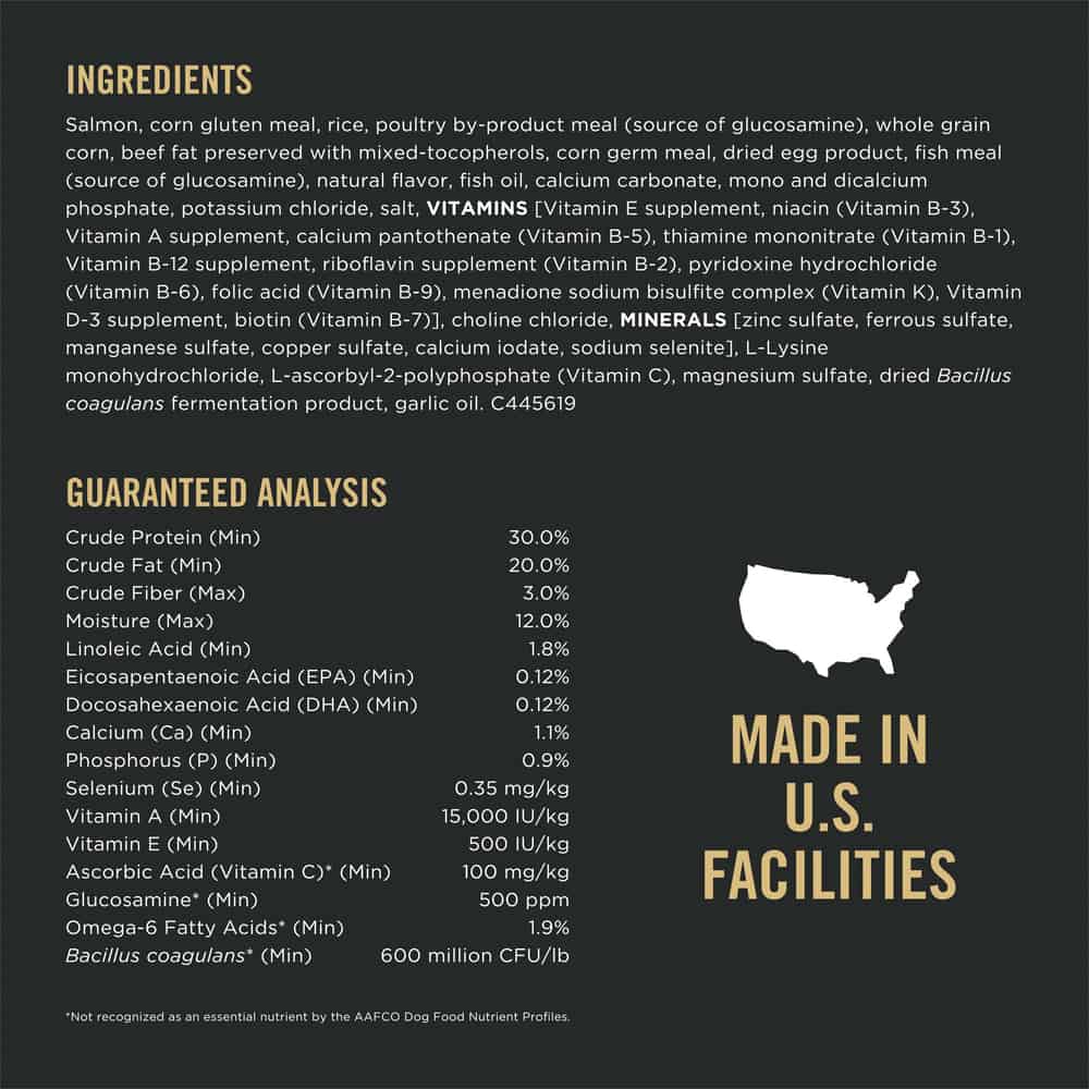 Salmon, Corn Gluten Meal, Rice, Poultry By-Product Meal (Source Of Glucosamine), Whole Grain Corn, Beef Fat Preserved With Mixed-Tocopherols, Corn Germ Meal, Dried Egg Product, Fish Meal (Source Of Glucosamine), Natural Flavor, Fish Oil, Calcium Carbonate, Mono And Dicalcium Phosphate, Potassium Chloride, Salt, VITAMINS [Vitamin E Supplement, Niacin (Vitamin B-3), Vitamin A Supplement, Calcium Pantothenate (Vitamin B-5), Thiamine Mononitrate (Vitamin B-1), Vitamin B-12 Supplement, Riboflavin Supplement (Vitamin B-2), Pyridoxine Hydrochloride (Vitamin B-6), Folic Acid (Vitamin B-9), Menadione Sodium Bisulfite Complex (Vitamin K), Vitamin D-3 Supplement, Biotin (Vitamin B-7)], Choline Chloride, MINERALS [Zinc Sulfate, Ferrous Sulfate, Manganese Sulfate, Copper Sulfate, Calcium Iodate, Sodium Selenite], L-Lysine Monohydrochloride, L-Ascorbyl-2-Polyphosphate (Vitamin C), Magnesium Sulfate, Dried Bacillus Coagulans Fermentation Product, Garlic Oil. C445619