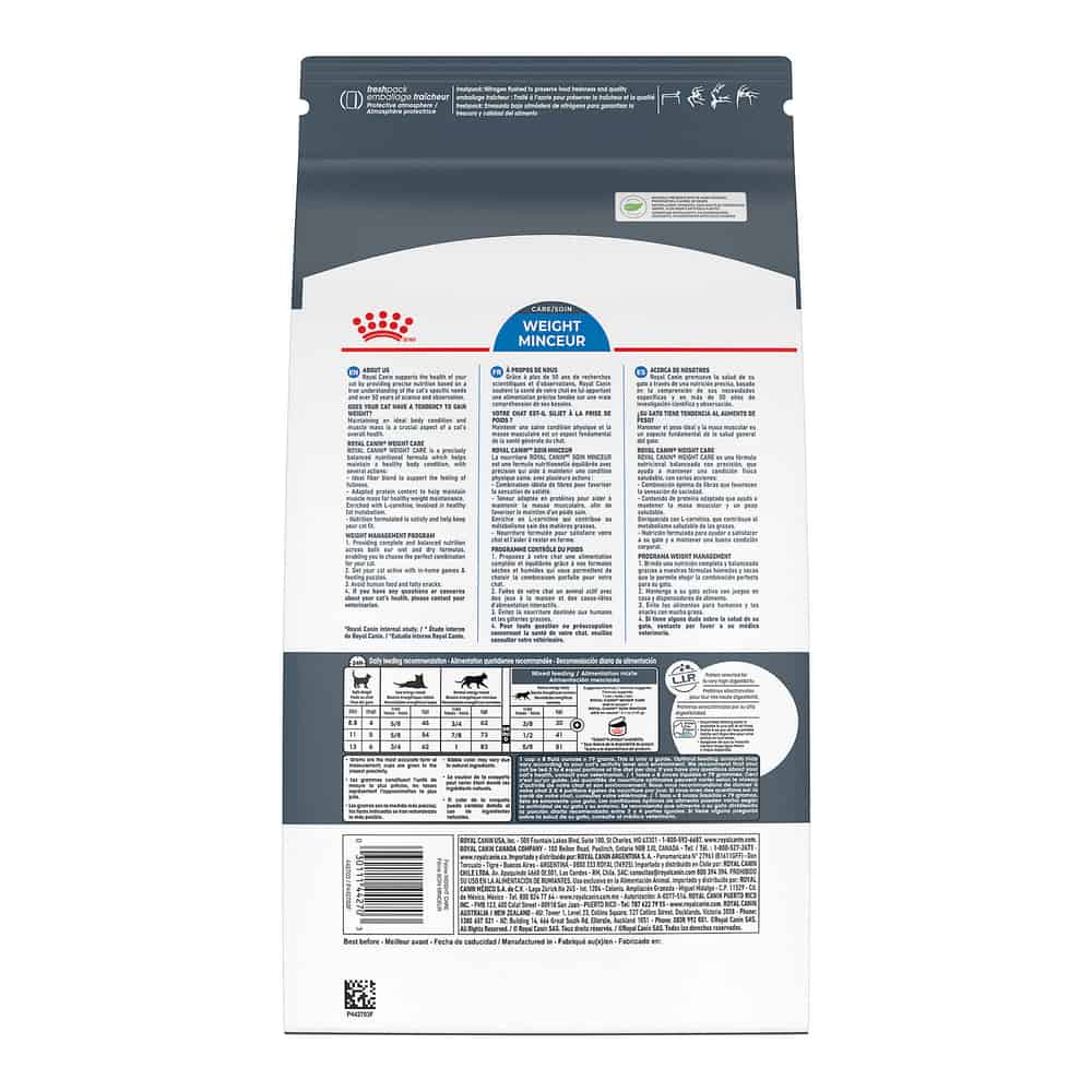 This weight management diet features a precise fiber blend to help keep your cat feeling full. The weight care formula of this indoor cat food helps provide muscle support for healthy body condition. In addition, this Royal Canin cat food delivers L-carnitine with each serving to help with fat metabolism and adapted protein content for muscle mass maintenance. During your cat's annual exam, consult your veterinarian about any concerns you have about your cat's weight or general health. Help unleash your adult cat's full potential with Royal Canin Feline Care Nutrition Weight Care Cat Food.