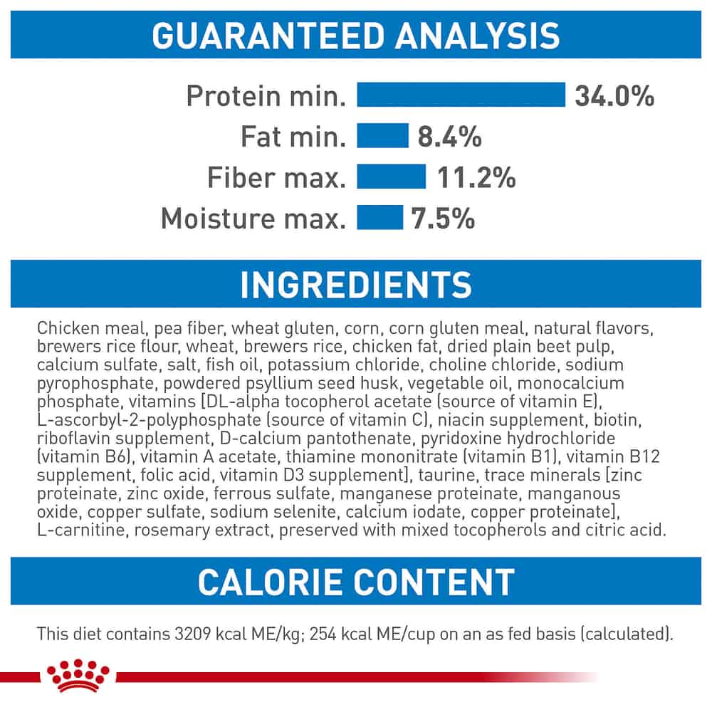 Chicken meal, pea fiber, wheat gluten, corn, corn gluten meal, natural flavors, brewers rice flour, brewers rice, wheat, chicken fat, dried plain beet pulp, calcium sulfate, fish oil, salt, potassium chloride, sodium pyrophosphate, monocalcium phosphate, psyllium seed husk, calcium carbonate, vegetable oil, choline chloride, vitamins [DL-alpha tocopherol acetate (source of vitamin E), L-ascorbyl-2-polyphosphate (source of vitamin C), niacin supplement, biotin, riboflavin supplement, D-calcium pantothenate, pyridoxine hydrochloride (vitamin B6), vitamin A acetate, thiamine mononitrate (vitamin B1), vitamin B12 supplement, folic acid, vitamin D3 supplement], taurine, trace minerals [zinc proteinate, zinc oxide, ferrous sulfate, manganese proteinate, manganous oxide, copper sulfate, calcium iodate, sodium selenite, copper proteinate], L-carnitine, rosemary extract, preserved with mixed tocopherols and citric acid.